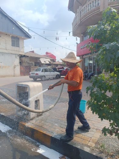 شستشو و گندزدایی سطلهای زباله ثابت مسیر میدان دیلمان تا میدان امام حسین توسط نیروهای خدمات شهری شهرداری سیاهکل